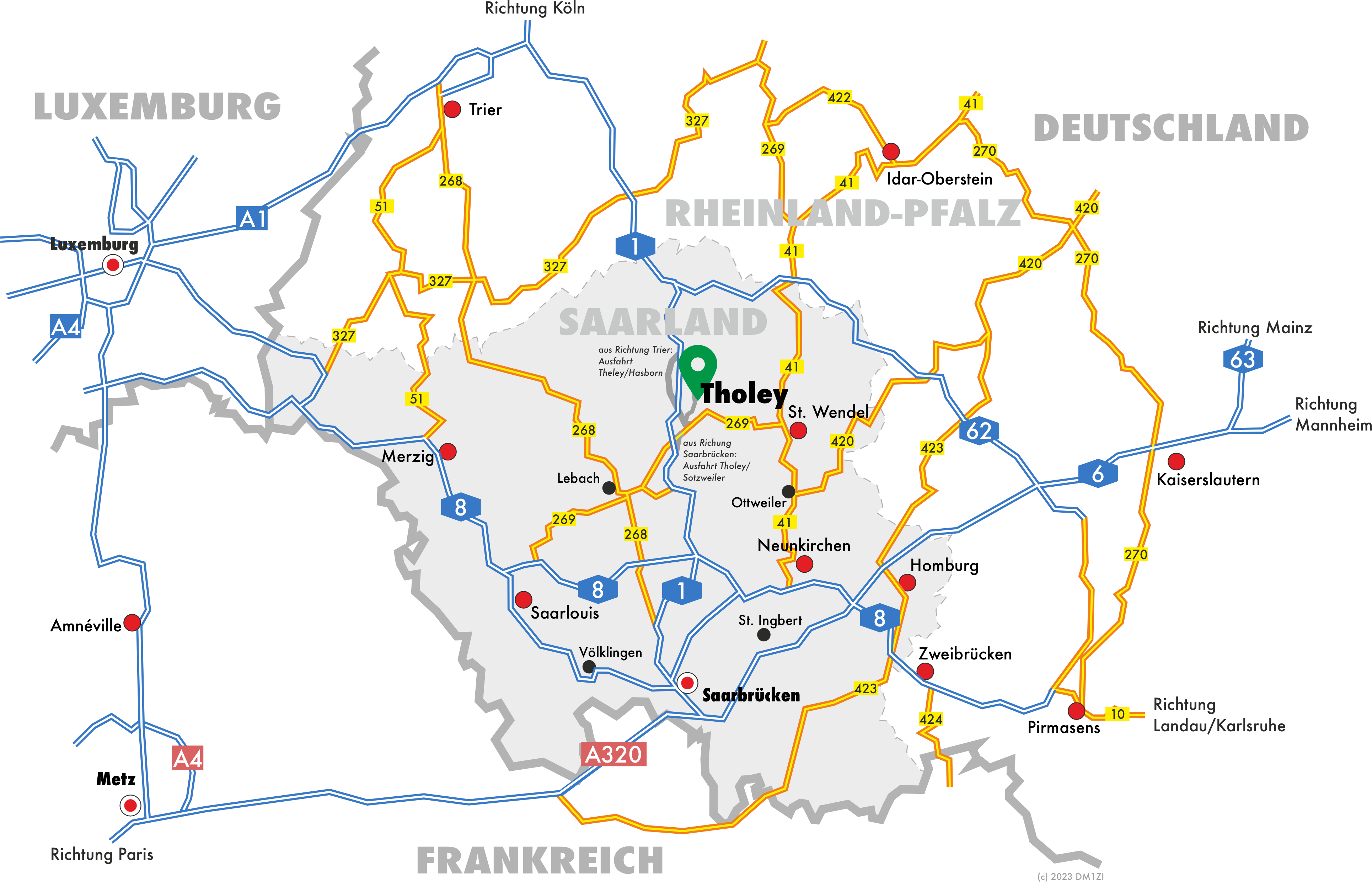 Aus Fahrtrichtung Saarbrücken Anschlussstelle Nr. 140 "Tholey" nehmen und rechts abbiegen auf die B268. Durch Sotzweiler durchfahren Richtung Tholey. In Tholey bis zum Kreisel fahren, dort die 2. Ausfahrt Richtung Theley nehmen und dann direkt nach dem Kreisel nach rechts abbiegen, Anschließend in die erste Straße links "Varuswaldstraße" einfahren.